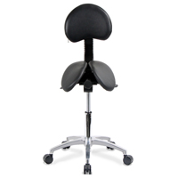 The saddle design keeps the toes either in line with the knees (which are splayed and drawn back toward the hips), or even further back - below the hips, rather than extended forward of the knees as they would be on a leaning stool. This makes it possible to work at surfaces built on top of base cabinets or shelves, something that is not possible with traditional chairs (where the knees are too far forward) or leaning/perching seats (where the feet and knees are too far forward). The MVMNT also keeps the torso in an ergonomically desirable upright position, while at the same time providing stability and reducing the need to bend forward from the waist. This posture is especially beneficial when fine control is needed or when greater effort must be exerted. The small back rest offers temporary support for those who like to lean back occasionally to rest their back.